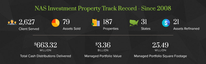 NASIS’ sister company, National Asset Services (NAS) is one of the Nation’s leading commercial real estate management companies and has established an impressive track record for investment property management. Since 2008, the NAS management team has successfully delivered $663.32 Million in cash distributions to 2,627 property investors. The track record includes managing a commercial real estate portfolio of 187 diverse commercial properties in 31 states, comprised of 25.49 million square feet. The overall value of NAS’ managed portfolio since 2008 totals $3.36 billion.